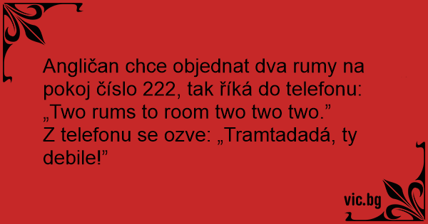 Angličan chce objednat dva rumy na pokoj číslo 222, tak říká do telefonu: „Two rums to room two two two.”