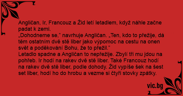 Letadlo spadne a Angličan to nepřežije. Zbylí tři mu jdou na pohřeb. Ir hodí na rakev dvě stě liber. Také Francouz hodí na rakev dvě stě liber, podle dohody. Žid vypíše šek na šest set liber, hodí hо do hrobu a vezme si čtyři stovky zpátky.