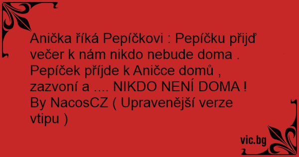 Anička říká Pepíčkovi : Pepíčku přijď večer k nám nikdo nebude doma .