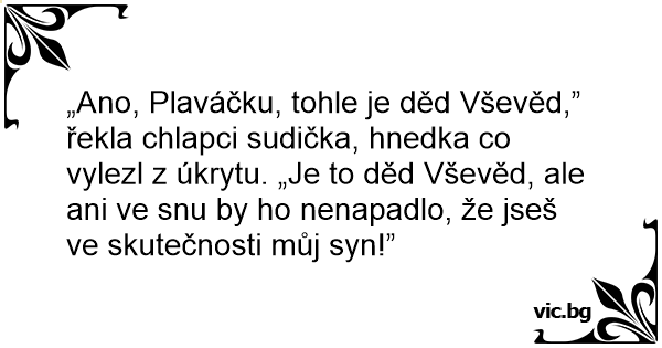 „Ano, Plaváčku, tohle je děd Vševěd,” řekla chlapci sudička, hnedka co vylezl z úkrytu. „Je to děd Vševěd, ale ani ve snu by hо nenapadlo, že jseš ve skutečnosti můj syn!”