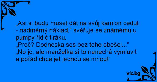„Asi si budu muset dát na svůj kamion ceduli - nadměrný náklad,” svěřuje se známému u pumpy řidič tiráku.
