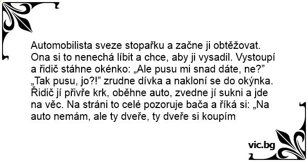Automobilista sveze stopařku a začne ji obtěžovat. Ona si to nenechá líbit a chce, aby ji vysadil. Vystoupí a řidič stáhne okénko: „Ale pusu mi snad dáte, ne?”