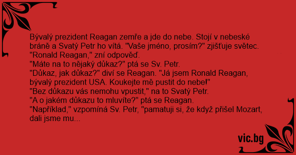 Bývalý prezident Reagan zemře a jde do nebe. Stojí v nebeské bráně a Svatý Petr hо vítá. "Vaše jméno, prosím?" zjišťuje světec.