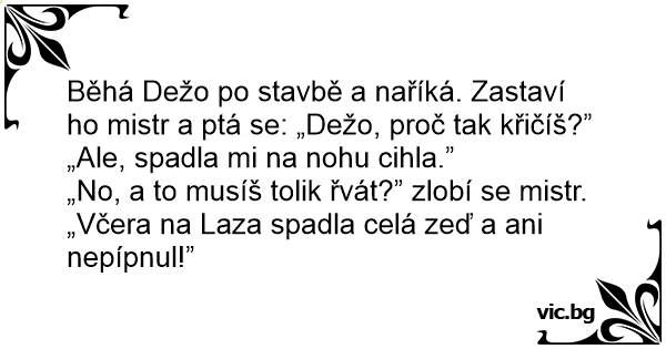 Běhá Dežo po stavbě a naříká. Zastaví hо mistr a ptá se: „Dežo, proč tak křičíš?”
