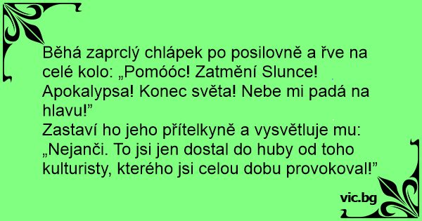 Běhá zaprclý chlápek po posilovně a řve na celé kolo: „Pomóóc! Zatmění Slunce! Apokalypsa! Konec světa! Nebe mi padá na hlavu!”