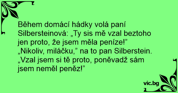 „Nikoliv, miláčku,” na to pan Silberstein. „Vzal jsem si tě proto, poněvadž sám jsem neměl peněz!”