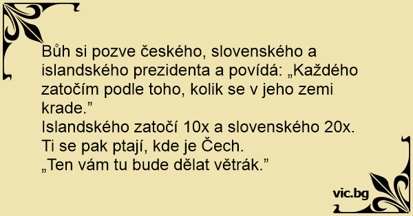 Bůh si pozve českého, slovenského a islandského prezidenta a povídá: „Každého zatočím podle toho, kolik se v jeho zemi krade.”