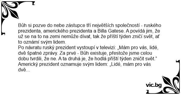 Bůh si pozve do nebe zástupce tří největších společností - ruského prezidenta, amerického prezidenta a Billa Gatese. A povídá jim, že už se na to na zemi nemůže dívat, tak že příští týden zničí svět, ať to oznámí svým lidem.