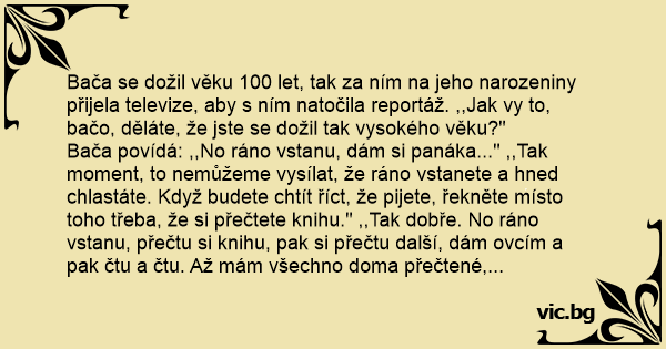 Bača se dožil věku 100 let, tak za ním na jeho narozeniny přijela televize, aby s ním natočila reportáž. ,,Jak vy to, bačo, děláte, že jste se dožil tak vysokého věku?"
