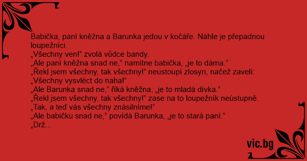 „Ale babičku snad ne,” povídá Barunka, „je to stará paní.”