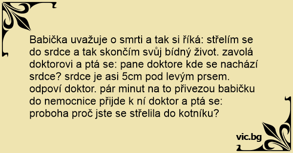 Babička uvažuje o smrti a tak si říká: střelím se do srdce a tak skončím svůj bídný život. zavolá doktorovi a ptá se: pane doktore kde se nachází srdce? srdce je asi 5cm pod levým prsem. odpoví doktor. pár minut na to přivezou babičku do nemocnice přijde k ní doktor a ptá se: proboha proč jste se střelila do kotníku?