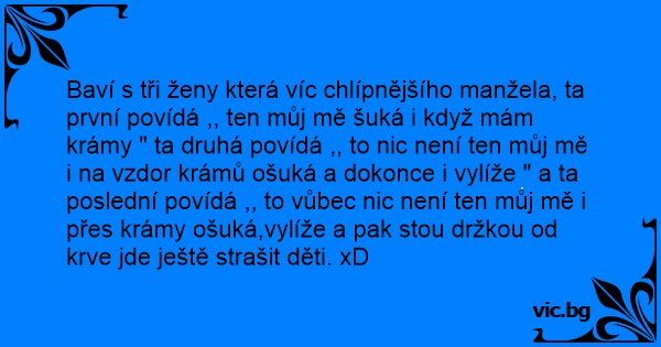 Baví s tři ženy která víc chlípnějšího manžela, ta první povídá ,, ten můj mě šuká i když mám krámy " ta druhá povídá ,, to nic není ten můj mě i na vzdor krámů ošuká a dokonce i vylíže " a ta poslední povídá ,, to vůbec nic není ten můj mě i přes krámy ošuká,vylíže a pak stou držkou od krve jde ještě strašit děti. xD