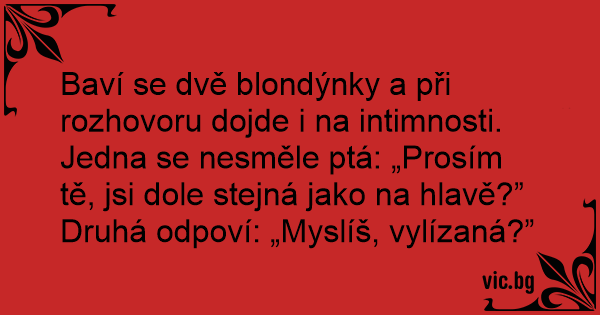 Baví se dvě blondýnky a při rozhovoru dojde i na intimnosti. Jedna se nesměle ptá: „Prosím tě, jsi dole stejná jako na hlavě?”
