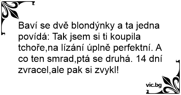 Baví se dvě blondýnky a ta jedna povídá: Tak jsem si ti koupila tchoře,na lízání úplně perfektní. A co ten smrad,ptá se druhá. 14 dní zvracel,ale pak si zvykl!