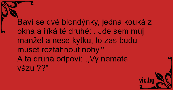 Baví se dvě blondýnky, jedna kouká z okna a říká té druhé: ,,Jde sem můj manžel a nese kytku, to zas budu muset roztáhnout nohy."
