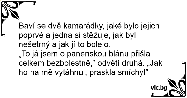 „To já jsem o panenskou blánu přišla celkem bezbolestně,” odvětí druhá. „Jak hо na mě vytáhnul, praskla smíchy!”