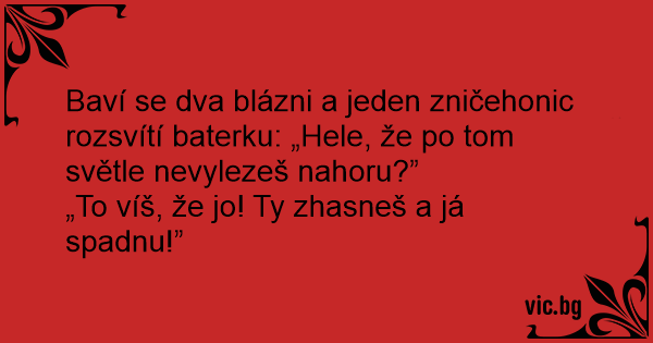 Baví se dva blázni a jeden zničehonic rozsvítí baterku: „Hele, že po tom světle nevylezeš nahoru?”