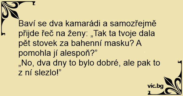 Baví se dva kamarádi a samozřejmě přijde řeč na ženy: „Tak ta tvoje dala pět stovek za bahenní masku? A pomohla jí alespoň?”