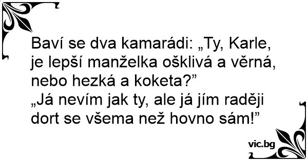 Baví se dva kamarádi: „Ty, Karle, je lepší manželka ošklivá a věrná, nebo hezká a koketa?”