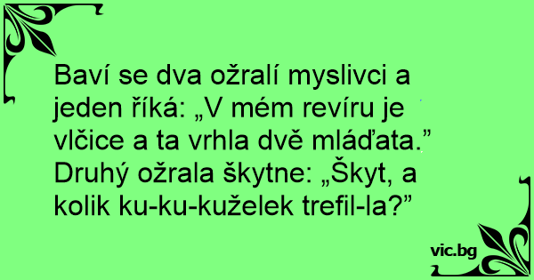 Baví se dva ožralí myslivci a jeden říká: „V mém revíru je vlčice a ta vrhla dvě mláďata.”