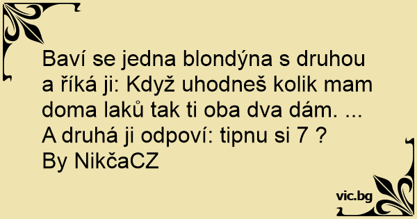 Baví se jedna blondýna s druhou a říká ji: Když uhodneš kolik mam doma laků tak ti oba dva dám. ... A druhá ji odpoví: tipnu si 7 ?
