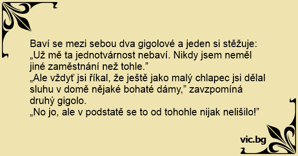 Baví se mezi sebou dva gigolové a jeden si stěžuje: „Už mě ta jednotvárnost nebaví. Nikdy jsem neměl jiné zaměstnání než tohle.”
