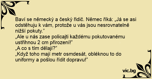 Baví se německý a český řidič. Němec říká: „Já se asi odstěhuju k vám, protože u vás jsou nesrovnatelně nižší pokuty.”