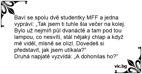 Baví se spolu dvě studentky MFF a jedna vypráví: „Tak jsem ti tuhle šla večer na kolej. Bylo už nejmíň půl dvanácté a tam pod tou lampou, co nesvítí, stál nějaký chlap a když mě viděl, mlsně se olízl. Dovedeš si představit, jak jsem utíkala?”
