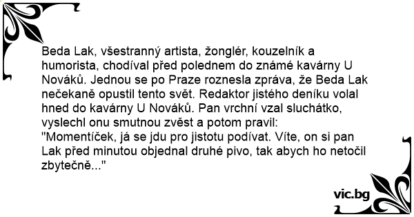 Beda Lak, všestranný artista, žonglér, kouzelník a humorista, chodíval před polednem do známé kavárny U Nováků. Jednou se po Praze roznesla zpráva, že Beda Lak nečekaně opustil tento svět. Redaktor jistého deníku volal hned do kavárny U Nováků. Pan vrchní vzal sluchátko, vyslechl onu smutnou zvěst a potom pravil: