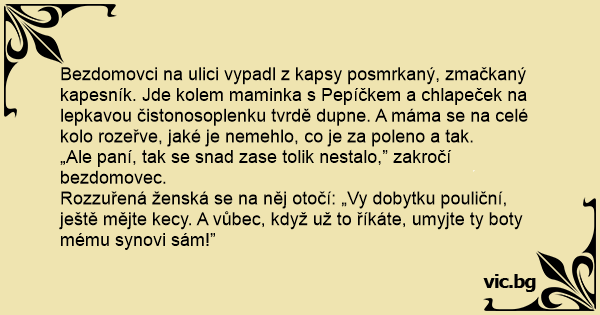 Bezdomovci na ulici vypadl z kapsy posmrkaný, zmačkaný kapesník. Jde kolem maminka s Pepíčkem a chlapeček na lepkavou čistonosoplenku tvrdě dupne. A máma se na celé kolo rozeřve, jaké je nemehlo, co je za poleno a tak.