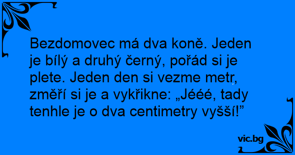 Bezdomovec má dva koně. Jeden je bílý a druhý černý, pořád si je plete. Jeden den si vezme metr, změří si je a vykřikne: „Jééé, tady tenhle je o dva centimetry vyšší!”