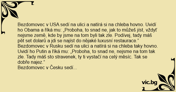 Bezdomovec v Rusku sedí na ulici a natírá si na chleba taky hovno. Uvidí hо Putin a říká mu: „Proboha, to snad ne, nejsme na tom tak zle. Tady máš sto stravenek, ty ti vystačí na celý měsíc. Tak se dobře najez.”
