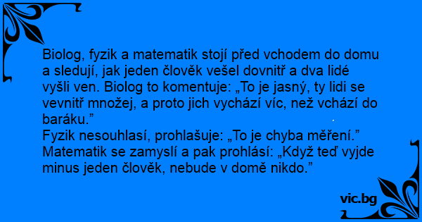 Biolog, fyzik a matematik stojí před vchodem do domu a sledují, jak jeden člověk vešel dovnitř a dva lidé vyšli ven. Biolog to komentuje: „To je jasný, ty lidi se vevnitř množej, a proto jich vychází víc, než vchází do baráku.”