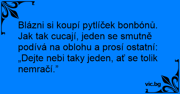 Blázni si koupí pytlíček bonbónů. Jak tak cucají, jeden se smutně podívá na oblohu a prosí ostatní: „Dejte nebi taky jeden, ať se tolik nemračí.”