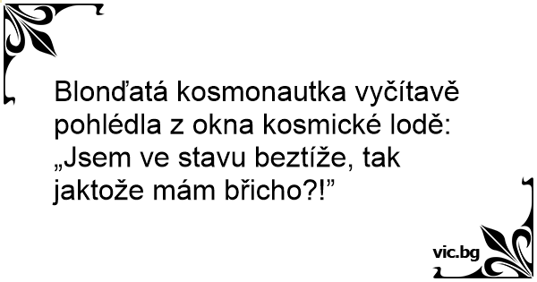 Blonďatá kosmonautka vyčítavě pohlédla z okna kosmické lodě: „Jsem ve stavu beztíže, tak jaktože mám břicho?!”