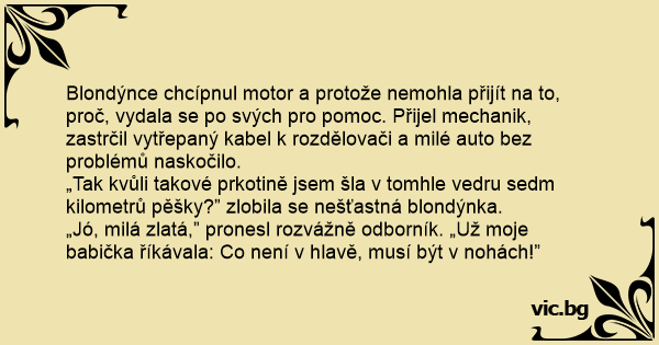 „Jó, milá zlatá,” pronesl rozvážně odborník. „Už moje babička říkávala: Co není v hlavě, musí být v nohách!”
