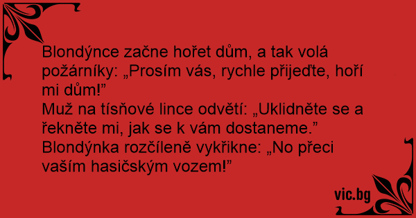 Blondýnce začne hořet dům, a tak volá požárníky: „Prosím vás, rychle přijeďte, hoří mi dům!”