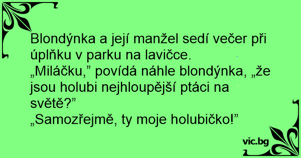 „Miláčku,” povídá náhle blondýnka, „že jsou holubi nejhloupější ptáci na světě?”