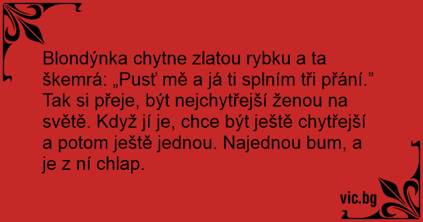 Blondýnka chytne zlatou rybku a ta škemrá: „Pusť mě a já ti splním tři přání.”