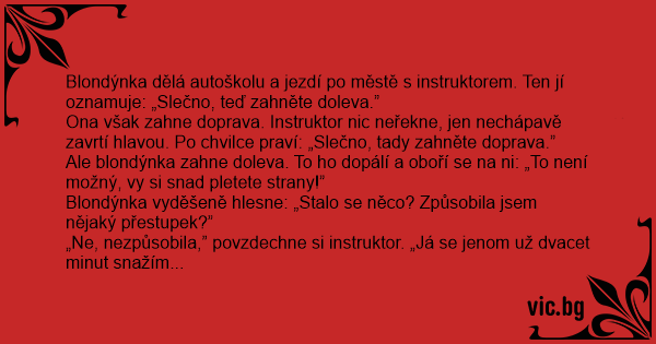 Blondýnka dělá autoškolu a jezdí po městě s instruktorem. Ten jí oznamuje: „Slečno, teď zahněte doleva.”