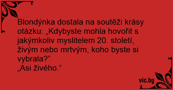 Blondýnka dostala na soutěži krásy otázku: „Kdybyste mohla hovořit s jakýmkoliv myslitelem 20. století, živým nebo mrtvým, koho byste si vybrala?”