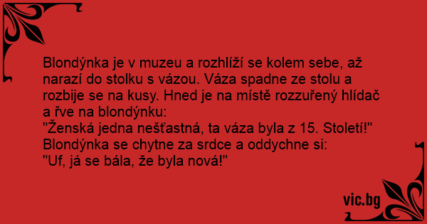 Blondýnka je v muzeu a rozhlíží se kolem sebe, až narazí do stolku s vázou. Váza spadne ze stolu a rozbije se na kusy. Hned je na místě rozzuřený hlídač a řve na blondýnku: