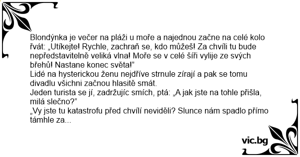 Blondýnka je večer na pláži u moře a najednou začne na celé kolo řvát: „Utíkejte! Rychle, zachraň se, kdo můžeš! Za chvíli tu bude nepředstavitelně veliká vlna! Moře se v celé šíři vylije ze svých břehů! Nastane konec světa!”