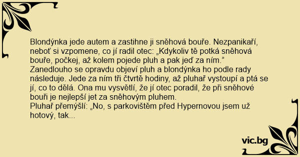 Blondýnka jede autem a zastihne ji sněhová bouře. Nezpanikaří, neboť si vzpomene, co jí radil otec: „Kdykoliv tě potká sněhová bouře, počkej, až kolem pojede pluh a pak jeď za ním.”
