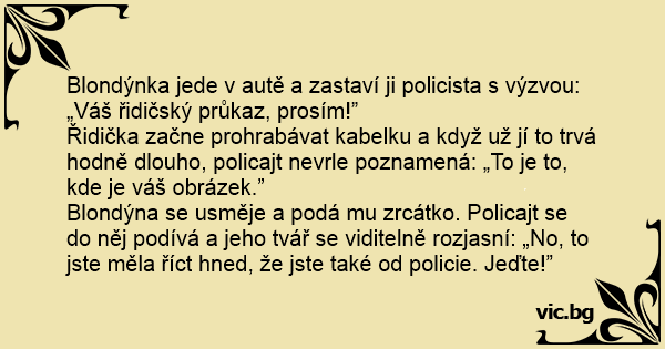 Blondýna se usměje a podá mu zrcátko. Policajt se do něj podívá a jeho tvář se viditelně rozjasní: „No, to jste měla říct hned, že jste také od policie. Jeďte!”