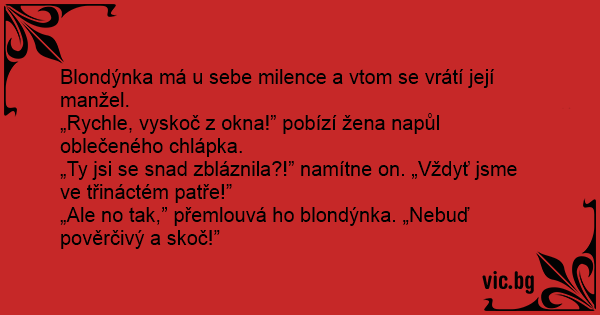 „Ty jsi se snad zbláznila?!” namítne on. „Vždyť jsme ve třináctém patře!”
