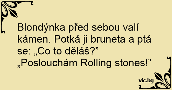 Blondýnka před sebou valí kámen. Potká ji bruneta a ptá se: „Co to děláš?”