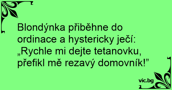 Blondýnka přiběhne do ordinace a hystericky ječí: „Rychle mi dejte tetanovku, přefikl mě rezavý domovník!”