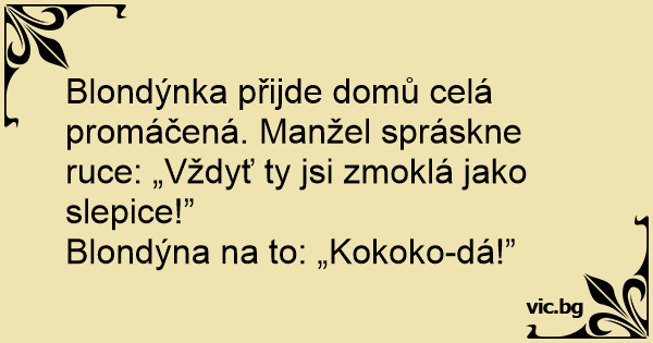 Blondýnka přijde domů celá promáčená. Manžel spráskne ruce: „Vždyť ty jsi zmoklá jako slepice!”