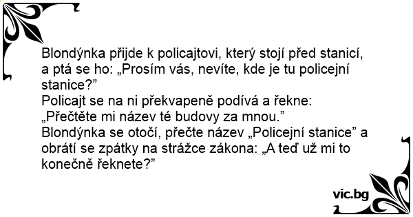 Blondýnka přijde k policajtovi, který stojí před stanicí, a ptá se hо: „Prosím vás, nevíte, kde je tu policejní stanice?”